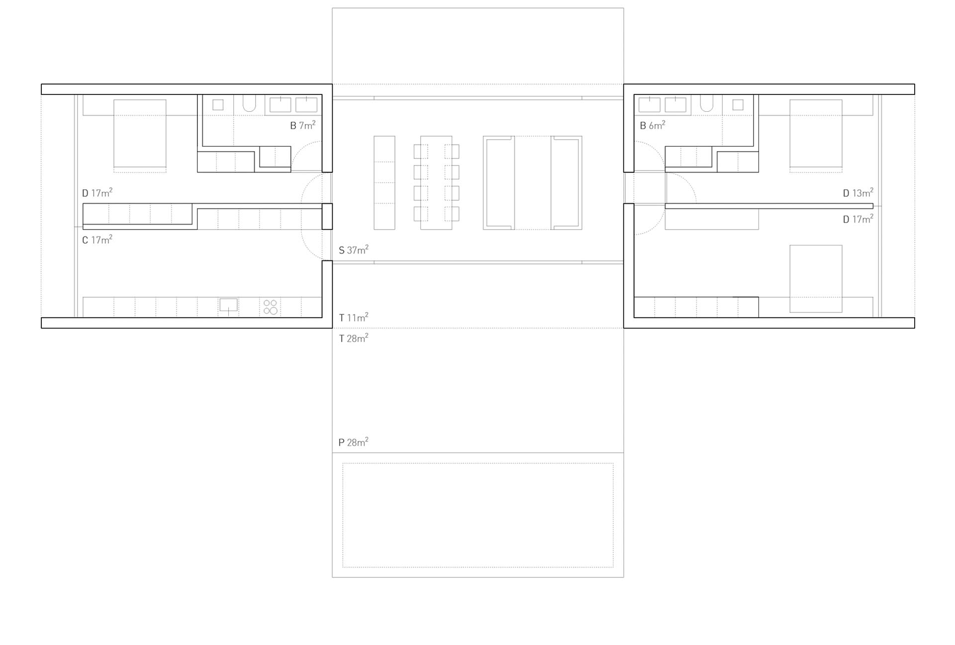 These rooms give onto the garden independently of the main area, and thus the uses and functioning of the house are divided and improved. For example, the kitchen is closed and thus independent from the main area. The N160 is a three-bedroom home: there is a master bedroom with an en-suite bathroom and two other bedrooms with a shared bath; the smaller bedroom can be transformed into an office.