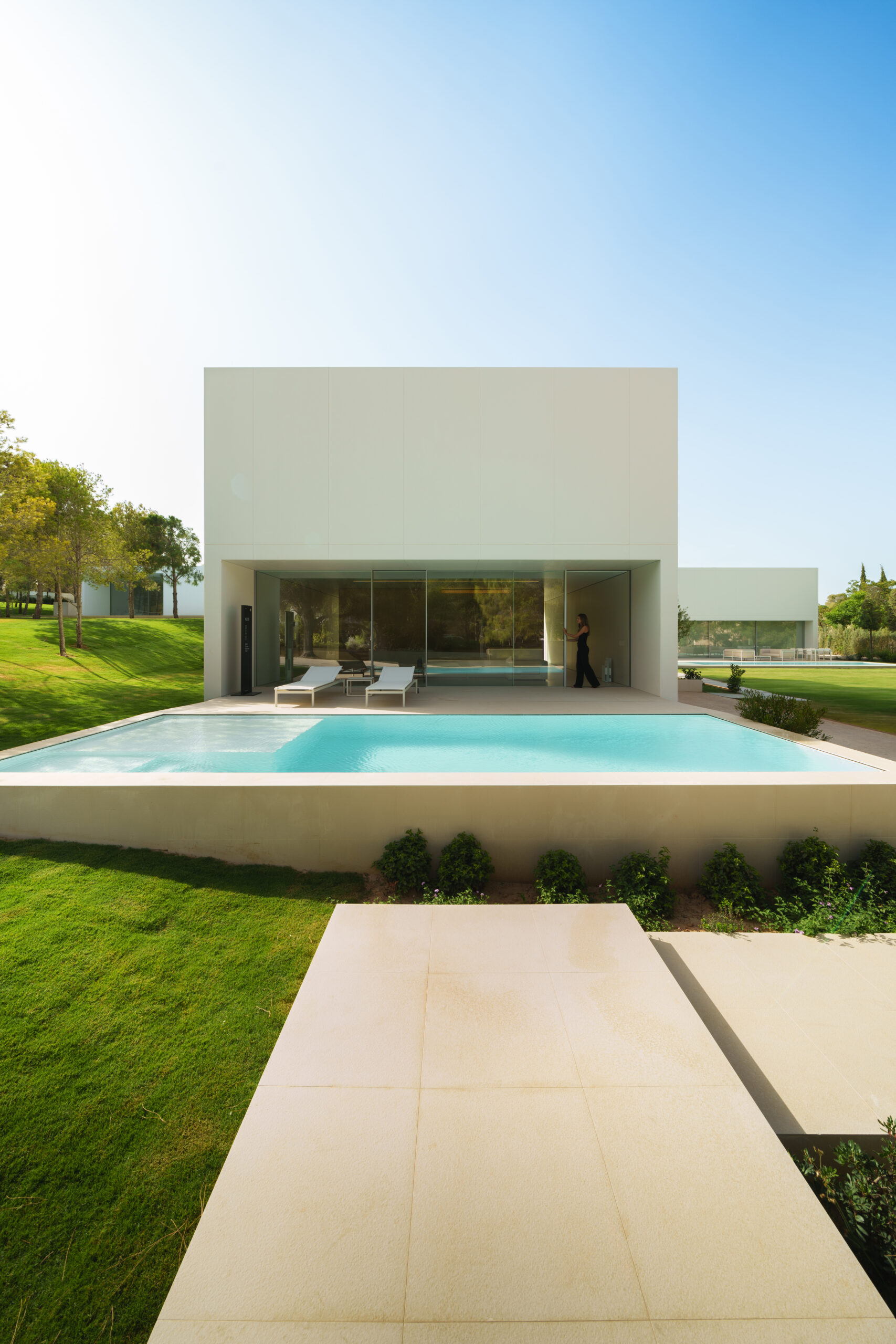It is a thoughtfully designed two-story home. The first-floor living-dining room gives onto a covered terrace that connects to the swimming pool; on the opposite side of the house, a separate kitchen opens onto an outdoor breakfast area.