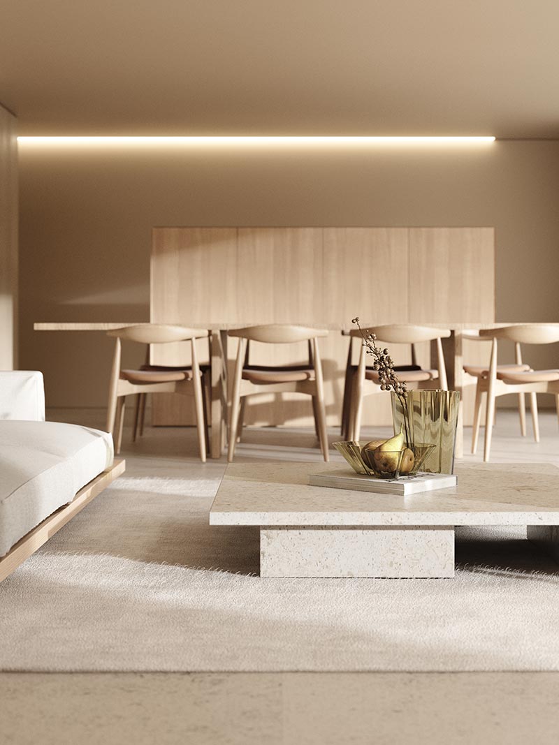 The design of our homes integrates all of the architectural elements, such as the distribution of furniture, lighting, fixtures, fittings and appliances, in such a way that everything is hidden and unified, which makes cleaning and maintenance all that much easier.