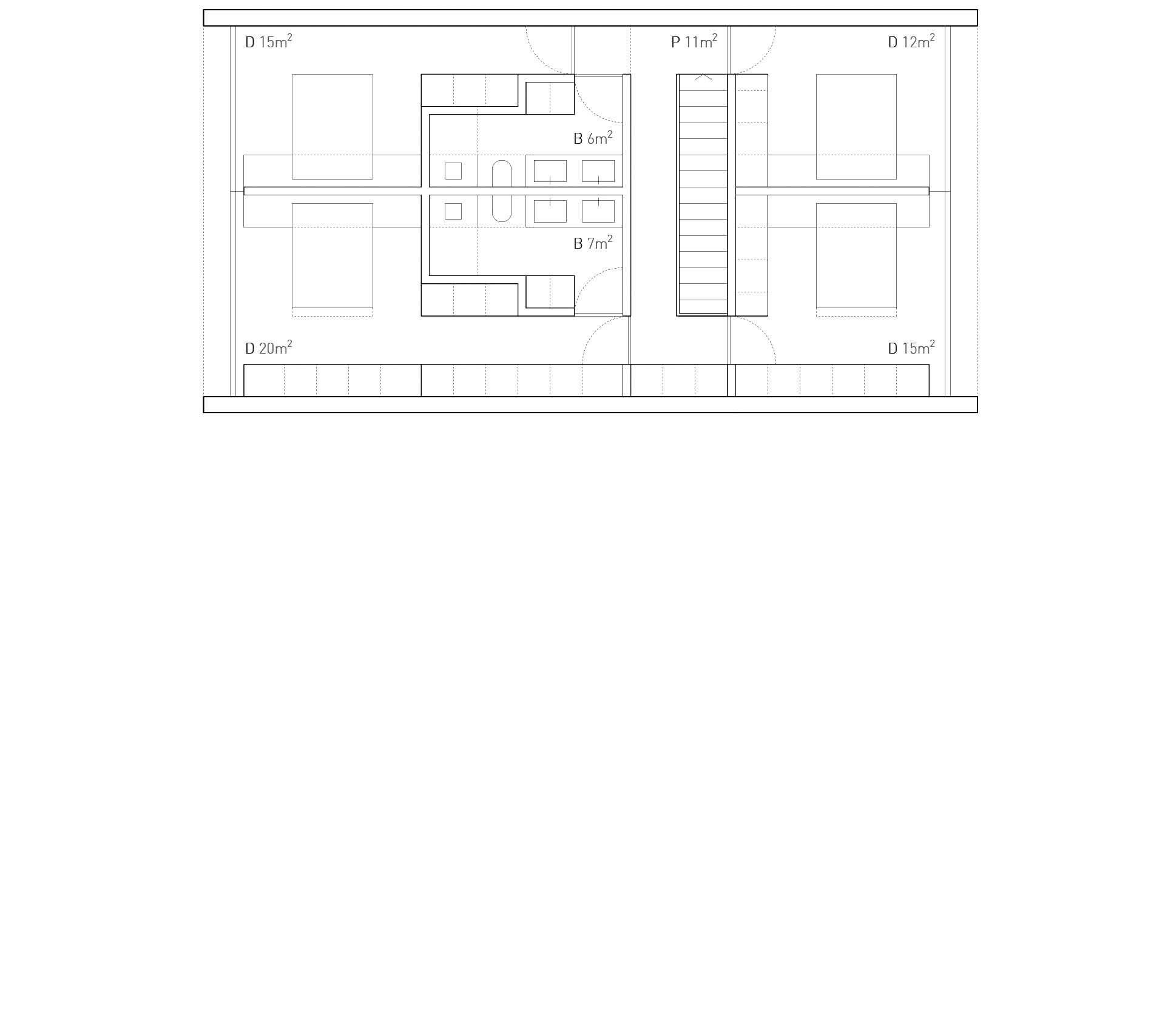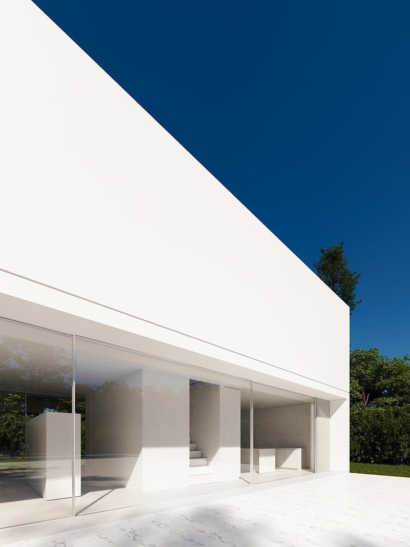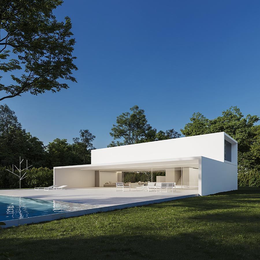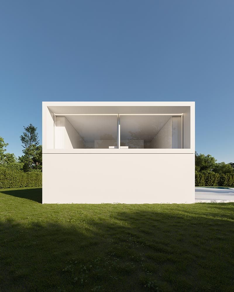 The two floors of the home have windows which face in the opposite directions. The first floor contains the day time spaces of the living-dining room and kitchen, separated by the service and communication core. The spaces are extended by a generous covered terrace that connects to the swimming pool.
